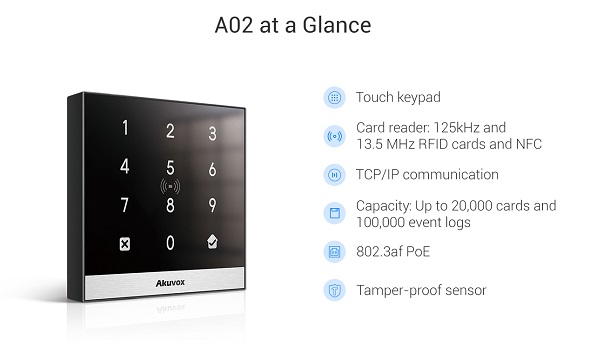 Akuvox A02S is an access control terminal equipped with an RFID reader, controller and touch keypad. It supports multiple modes of door access authentication for the users (PIN code, NFC and RFID). And it can be easily connected to a POE using an Ethernet cable for data transmission. A02S provides you with greater flexibility and security than those traditional access control systems.