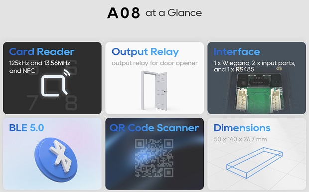Akuvox A08S is a slim access control terminal that combines a door controller and a card reader in one device, a cost-effective solution for building operators. This terminal offers multiple access control methods and credentials, including PIN code, QR scanning, wave-to-unlock via Bluetooth, mobile access via NFC and RFID cards. The A08S provides an ideal access control solution for buildings such as condominiums, apartment buildings, office buildings, gated communities and industrial buildings.