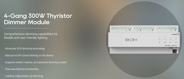 The Akubela 4 Gang 300w Thyristor Dimming Module is a versatile KNX smart device designed to meet the diverse needs of the smart home. Integrates manual operation, scheduled execution and real-time status monitoring functions, providing foundational support for home automation. Additionally, it is equipped with advanced technologies such as electric valve control, bus voltage monitoring and output signal inversion, significantly enhancing the system's adaptability and reliability. This is not merely a product but an indispensable component of the smart home ecosystem.