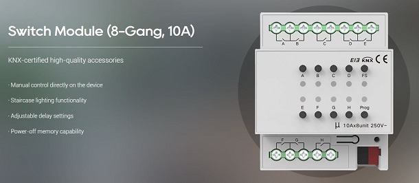 The 8-gang 10A switch module is a versatile KNX smart device equipped with eight independent output channels, seamlessly integrating manual operation, scheduled execution and real-time status monitoring functions. It boasts advantages in energy saving, flexibility and safety, making it an indispensable part of the smart home ecosystem.