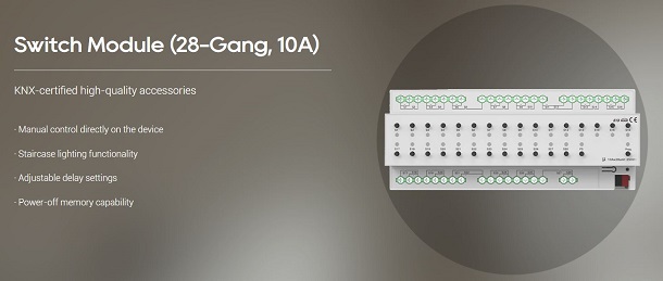 The 28-gang KNX switch module supports a maximum load of 10A per gang, making it ideal for lighting and device control in both residential and commercial scenarios. It can seamlessly integrate with other devices via the KNX protocol for coordinated control.