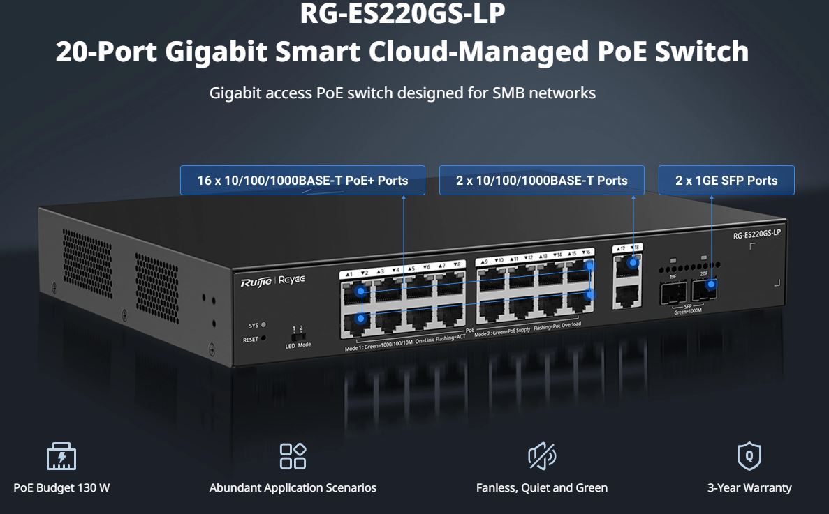 Ruijie-Reyee RG-ES220GS-LP 20-Port Gigabit Smart Cloud Managed PoE Switch with 16x 1G PoE/PoE+ Ports, 2x 1G RJ45 Ports, 2x 1G SFP Ports and 130W PoE Power Budjet